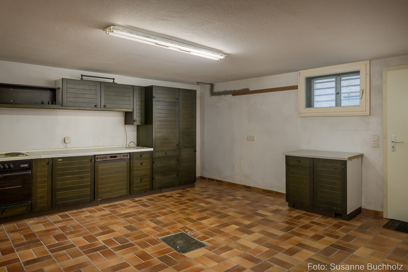 Ein separater Wirtschaftsraum mit funktionaler Einbauküche sowie Elektrogeräte bietet zudem direkten Zugang zum Garten über eine zusätzliche Kellertreppe.