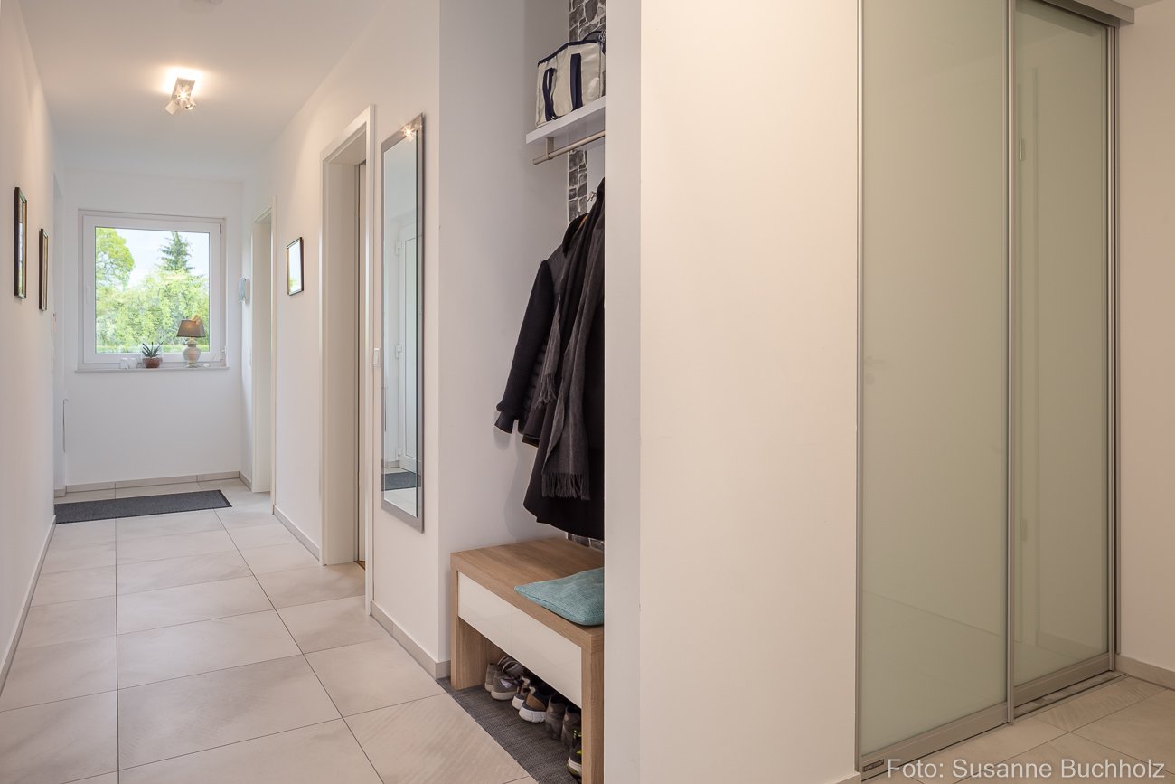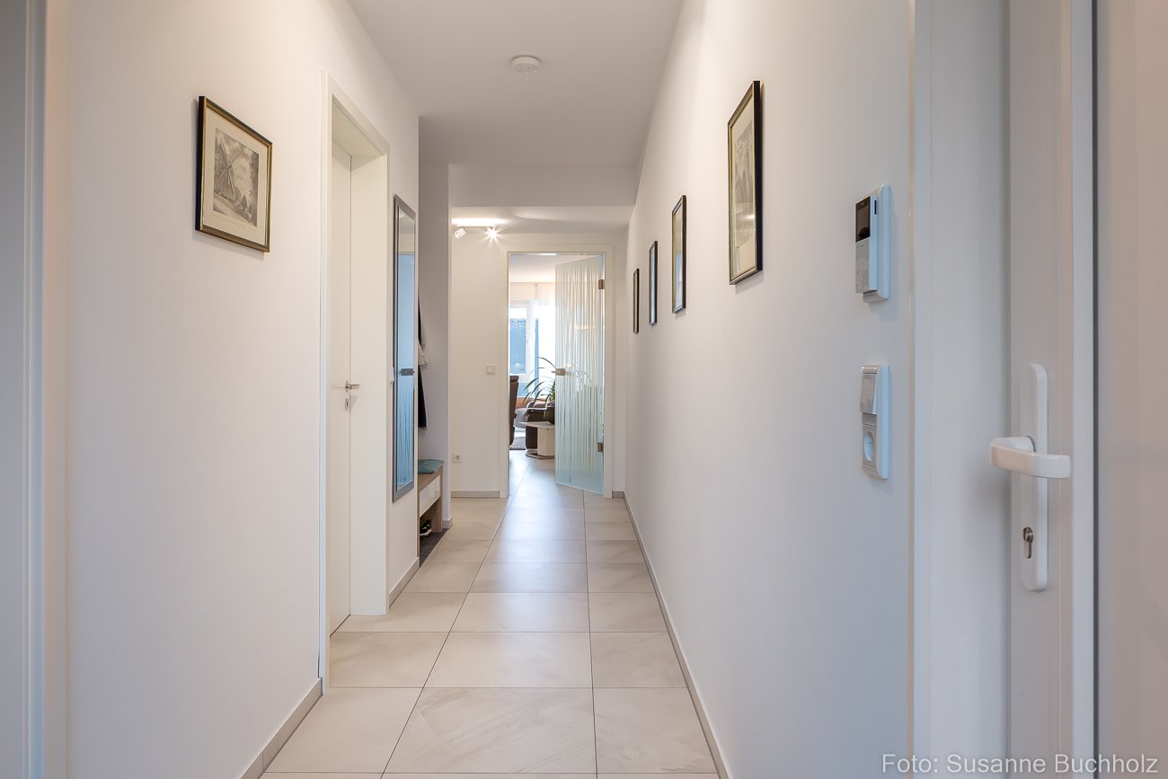 Über den geräumigen Flur erschließen sich die lichten Wohnräume und schon hier spiegelt sich das besondere Ambiente der Immobilie wider.