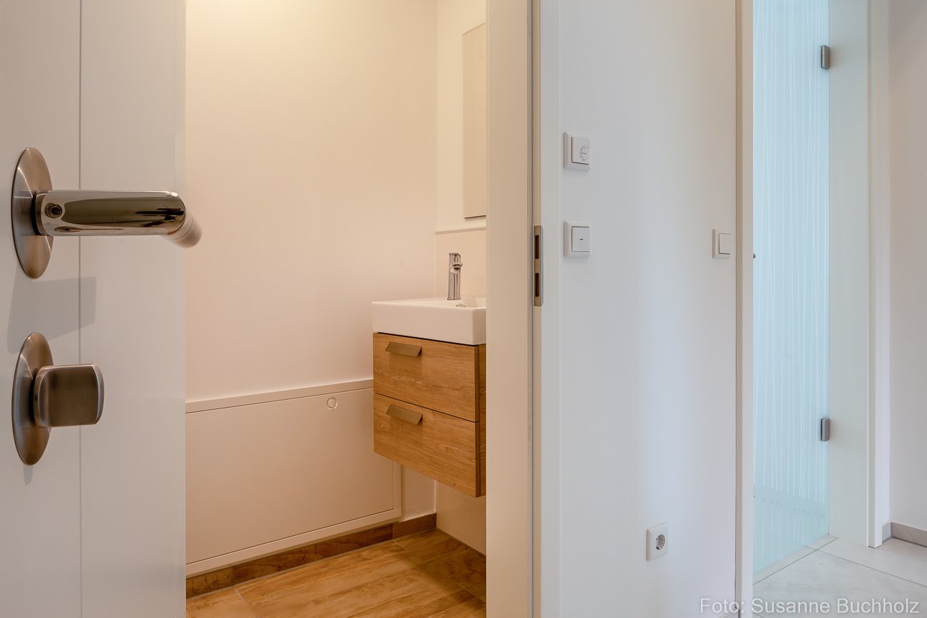 Selbstverständlich befindet sich in dieser Wohneinheit ein schickes Gäste-WC, welches ebenfalls wertvoll ausgestattet wurde.