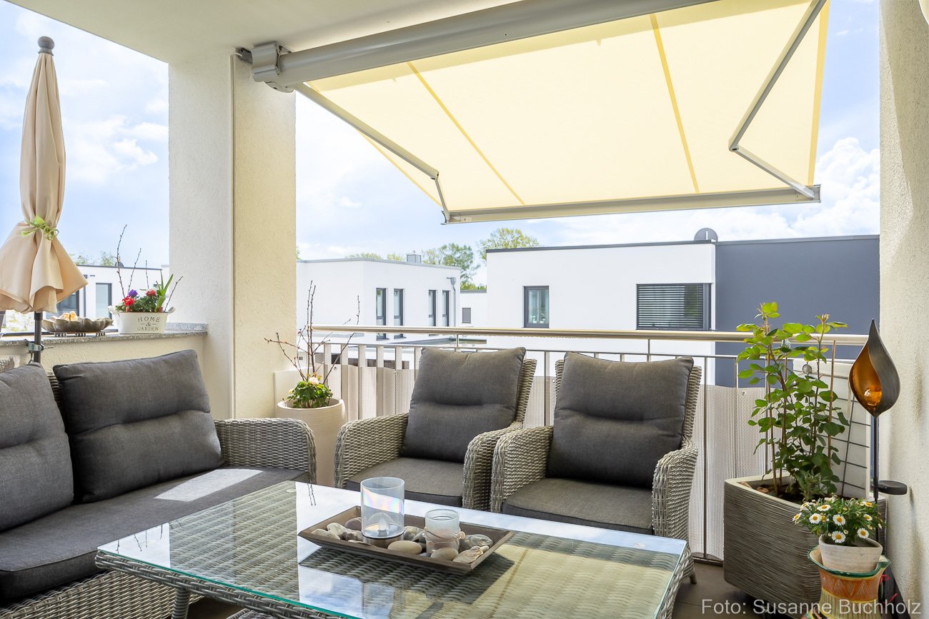 Auf der Südseite der Wohnung findet sich der gemütliche Lounge-Bereich, der dieses offene Herzstück der tollen Wohnung mit Zugang zur Südloggia, die mit ihrer Edelstahlbalustrade und der schützenden Markise für noblen Freilichtgenuss sorgt, aufrundet.
